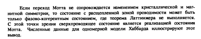 Если переход Мотта не сопровождается изменением кристаллической и магнитной симметрии, то состояние с расщепленной зоной проводимости может быть только фазово-когерентным состоянием, где теорема Латтинжера не выполняется. С этой точки зрения сверхпроводящее состояние является реализацией состояния Мотта. Численные данные для одномерной модели Хаббарда иллюстрируют этот вывод.