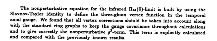 The nonperturbative equation for the infrared Il44(0)-limit is built by using the Slavnov-Taylor identity to define the three-gluon vertex function in the temporal axial gauge. We found that all vertex corrections should be taken into account along witl} the standard ring graphs to keep the gauge covariance throughout calculations and to give correctly the nonperturbative p3-term. This term is explicitly calculated and compared with the previously known results.