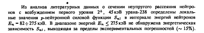 Из анализа литературных данных о сечении неупругого рассеяния нейтронов с возбуждением первого уровня 2+, 45кэВ урана-238 определены локальные значения р-нейтронной силовой функции Sn\ в интервале энергий нейтронов Еп 82^-275кэВ. В диапазоне энергий Еп < 275 кэВ не обнаружена энергетическая зависимость Sn\, выходящая за пределы экспериментальных погрешностей (~ 15%).