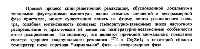 Прямой процесс спин-решеточной релаксации, обусловленной локальными тепловыми флуктуациями амплитуды волны атомных смещений в несоразмерной фазе кристалла, может существенно влиять на форму линии резонансного спектра, ослабляя интенсивность концевых температурно-зависимых пиков частотного распределения и практически не влияя на температурно-независимые особенности этого распределения. По-видимому, это является причиной аномального поведения спектра ядерного квадрупольного резонанса |271 в CS2Z11I4 в некоторой области температур ниже перехода "нормальная" фаза несоразмерная фаза.