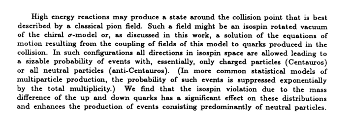 High energy reactions may produce a state around the collision point that is best described by a classical pion field. Such a field might be an isospin rotated vacuum of the chiral tr-model or, as discussed in this work, a solution of the equations of motion resulting from the coupling of fields of this model to quarks produced in the collision. In such configurations all directions in isospin space are allowed leading to a sizable probability of events with, essentially, only charged particles (Centauros) or all neutral particles (anti-Centauros). (In more common statistical models of multiparticle production, the probability of such events is suppressed exponentially by the total multiplicity.) We find that the isospin violation due to the mass difference of the up and down quarks has a significant effect on these distributions and enhances the production of events consisting predominantly of neutral particles.