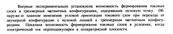 Впервые экспериментально установлена возможность формирования токовых слоев в трехмерных магнитных конфигурациях, содержащих нулевую точку. Об-наружело плавное изменение угловой ориентации токового слоя при переходе от двумерной конфигурации с нулевой линией к трехмерным магнитным конфигурациям. Показана возможность формирования токовых слоев в условиях, когда электрический ток перпендикулярен к сепаратрисной плоскости.