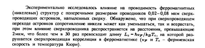Экспериментально исследовалось влияние на проводимость ферромагнитных (никелевых) структур с поперечными размсфами проводников 0,02-0,08 мкм сверхпроводящих островков, напыленных сверху. Обнаружено, что при сверхпроводящем переходе островков сопротивление никеля может как уменьшаться, так и возрастать, при этом влияние сверхпроводника распространяется на расстояния, превышающие 2мкм, что более чем в 30 раз превосходит длину Lc hvF/kBTCt на которой разрушается сверхпроводящая корреляция в <}>ерромагнетике (vF и Тс фермиевская скорость и температура Кюри).