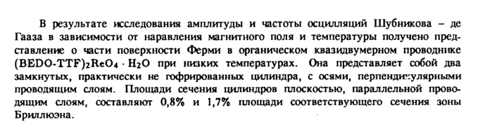 В результате исследования амплитуды и частоты осцилляции Шубникова де Гааза в зависимости от наравления магнитного поля и температуры получено представление о части поверхности Ферми в органическом квазидвумерном проводнике (BEDO-TTF)zReC>4 · НгО при низких температурах. Она представляет собой два замкнутых, практически не гофрированных цилиндра, с осями, перпендикулярными проводящим слоям. Площади сечения цилиндров плоскостью, параллельной проводящим слоям, составляют 0,8% и 1,7% площади соответствующего сечения зоны Бриллюэна.