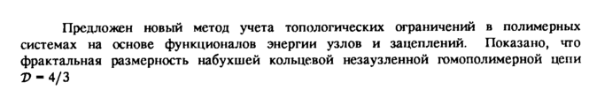 Предложен новый метод учета топологических ограничений в полимерных системах на основе функционалов энергии узлов и зацеплений. Показано, что фрактальная размерность набухшей кольцевой незаузленной гомополимерной цепи V -4/3