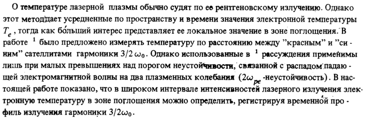 О температуре лазерной плазмы обычно судят по ее рентгеновскому излучению. Однако этот методйает усредненные по пространству и времени значения электронной температуры Те , тогда как больший интерес представляет ее локальное значение в зоне поглощения.'В работе 1 было предложено измерять температуру по расстоянию между "красным" и "си -ним" сателлитами гармоники 3/2 ω0. Однако использованные в 1 рассуждения применимы лишь при малых превышениях над порогом неустойчивости, связанной с распадом падаю -щей электромагнитной волны на два плазменных колебания (2ωρί -неустойчивость). В настоящей работе показано, что в широком интервале интенсивностей лазерного излучения электронную температуру в зоне поглощения можно определить, регистрируя временной про -филь излучения гармоники 3/2ω0 ■
