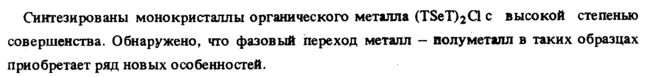 Синтезированы монокристаллы органического металла (TSeT^Cl с высокой степенью совершенства. Обнаружено, что фазовый переход металл полуметалл в таких образцах приобретает ряд новых особенностей.