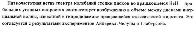 Низкочастотная ветвь спектра колебаний стопки дисков во вращающемся Hell при больших угловых скоростях соответствует возбуждению в объеме между дисками инер-циальной волны, известной в гидродинамике вращающейся классической жидкости. Это согласуется с результатами экспериментов Андерека, Челупы и Глаберсона.