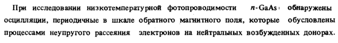 При исследовании низкотемпературной фотопроводимости л-GaAsi обнаружены осцилляции, периодичные в шкале обратного магнитного поля, которые обусловлены процессами неупругого рассеяния электронов на нейтральных возбужденных донорах.
