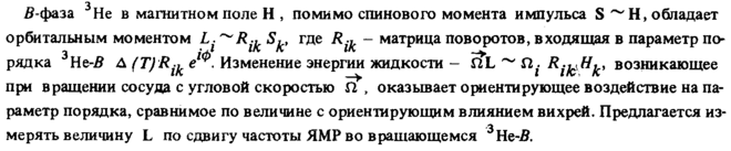 £-фаза Не в магнитном поле Η , помимо спинового момента импульса S ^Н, обладает орбитальным моментом L. S^, где R.^ матрица поворотов, входящая в параметр порядка 3Не-£ Δ (T)R^ е1<^. Изменение энергии жидкости f?L ~~ Ω^. R.^H^ возникающее при вращении сосуда с угловой скоростью п\ оказывает ориентирующее воздействие на параметр порядка, сравнимое по величине с ориентирующим влиянием вихрей. Предлагается измерять величину L по сдвигу частоты ЯМР во вращающемся 3Не«#.