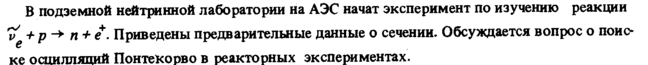 В подземной нейтринной лаборатории на АЭС начат эксперимент по изучению реакции "ν + ρ -*■ η + е. Приведены предварительные данные о сечении. Обсуждается вопрос о поиске осцилляций Понтекорво в реакторных экспериментах.