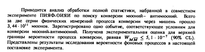 Приводится анализ обработки полной статистики, набранной в совместном эксперименте ПИЯФ-ОИЯИ по поиску конверсии мюонийантимюоний. Всего за две серии физических измерений процесса конверсии через мишень прошло 3,44-10" мюонов. Зарегистрировано одно событие, соответствующее условиям для конверсии мюоний-антимюоний. Получена экспериментальная оценка для верхней границы вероятности процесса конверсии, равная WMjg < 5, 1 10~7 (90% CL). Представлены результаты исследования вероятности фоновых процессов в настоящей постановке эксперимента.