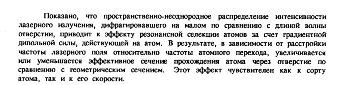 Показано, что пространственно-неоднородное распределение интенсивности лазерного излучения, дифрагировавшего на малом по сравнению с длиной волны отверстии, приводит к эффекту резонансной селекции атомов за счет градиентной дипольной силы, действующей на атом. В результате, в зависимости от расстройки частоты лазерного поля относительно частоты атомного перехода, увеличивается или уменьшается эффективное сечение прохождения атома через отверстие по сравнению с геометрическим сечением. Этот эффект чувствителен как к сорту атома, так и к его скорости.