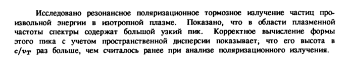 Исследовано резонансное поляризационное тормозное излучение частиц произвольной энергии в изотропной плазме. Показано, что в области плазменной частоты спектры содержат большой узкий пик. Корректное вычисление формы этого пика с учетом пространственной дисперсии показывает, что его высота в с/«т ДО3 больше, чем считалось ранее при анализе поляризационного излучения.