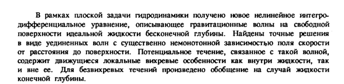 В рамках плоской задачи гидродинамики получено новое нелинейное интегро-дифференциальное уравнение, описывающее гравитационные волны на свободной поверхности идеальной жидкости бесконечной глубины. Найдены точные решения в виде уединенных волн с существенно немонотонной зависимостью поля скорости от расстояния до поверхности. Потенциальное течение, связанное с такой волной, содержит движущиеся локальные вихревые особенности как внутри жидкости, так и вне ее. Для безвихревых течений произведено обобщение на случай жидкости конечной глубины.