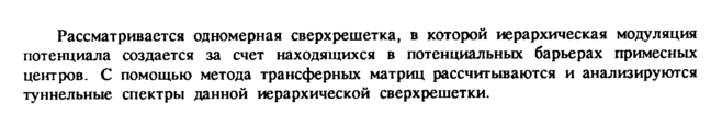 Рассматривается одномерная сверхрешетка, в которой иерархическая модуляция потенциала создается за счет находящихся в потенциальных барьерах примесных центров. С помощью метода трансферных матриц рассчитываются и анализируются туннельные спектры данной иерархической сверхрешетки.