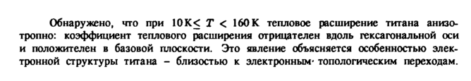 Обнаружено, что при 10K< Τ < 160К тепловое расширение титана анизотропно: коэффициент теплового расширения отрицателен вдоль гексагональной оси и положителен в базовой плоскости. Это явление объясняется особенностью электронной структуры титана близостью к электронным* топологическим переходам.