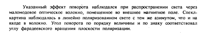Указанный эффект поворота наблюдался при распространении света через маломодовое оптическое волокно, помещенное во внешнее магнитное поле. Спекл-картина наблюдалась в линейно поляризованном свете с тем же азимутом, что и на входе в волокно. Угол поворота по порядку величины и по знаку соответствовал углу фарадеевского вращения плоскости поляризации.