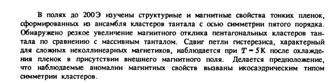 В полях до 200Э изучены структурные и магнитные свойства тонких пленок, сформированных из ансамбля кластеров тантала с осью симметрии пятого порядка. Обнаружено резкое увеличение магнитного отклика пентагональных кластеров тантала по сравнению с массивным танталом. Сдвиг петли гистерезиса, характерный для сложных неколлинеарных магнетиков, наблюдается при Г 5К после охлаждения пленок в присутствии внешнего магнитного поля. Делается предположение, что наблюдаемые аномалии магнитных свойств вызваны икосаэдрическим типом симметрии кластеров.