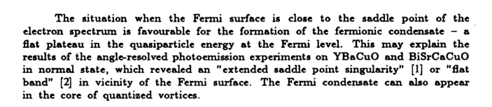 The situation when the Fermi surface is close to the saddle point of the electron spectrum is favourable for the formation of the fermionic condensate a flat plateau in the quasiparticle energy at the Fermi level. This may explain the results of the angle-resolved photoemission experiments on YBaCuO and BiSrCaCuO in normal state, which revealed an "extended saddle point singularity" [1] or "flat band" [2] in vicinity of the Fermi surface. The Fermi condensate can also appear in the core of quantized vortices.