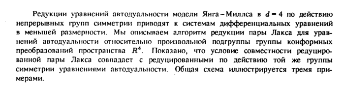 Редукции уравнений автодуальности модели Янга-Миллса в <ί-4 по действию непрерывных групп симметрии приводят к системам дифференциальных уравнений в меньшей размерности. Мы описываем алгоритм редукции пары Лакса для уравнений автодуалыюсти относительно произвольной подгруппы группы конформных преобразований пространства Я4. Показано, что условие совместности редуцированной пары Лакса совпадает с редуцированными по действию той же группы симметрии уравнениями автодуальности. Общая схема иллюстрируется тремя примерами.