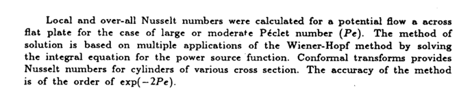 Local and over-all Nusselt numbers were calculated for a potential flow a across flat plate for the case of large or moderate Peclet number The method of solution is based on multiple applications of the Wiener-Hopf method by solving the integral equation for the power source function. Conformal transforms provides Nusselt numbers for cylinders of various cross section. The accuracy of the method is of the order of ехр(-2Яс).