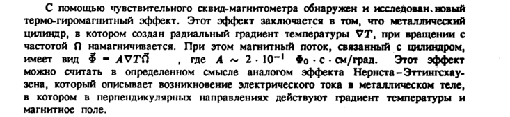 С помощью чувствительного сквид-магнитометра обнаружен и исследован, новый термо-гиромагнитный эффект. Этот эффект заключается в том, что металлический цилиндр, в котором создан радиальный градиент температуры VT, при вращении с частотой П намагничивается. При этом магнитный поток, связанный с цилиндром, имеет вид $ AVTU , где А ~ 2 · 10—1 Фо · с · см/град. Этот эффект можно считать в определенном смысле аналогом эффекта Нернста Эттингсхау-зена, который описывает возникновение электрического тока в металлическом теле, в котором в перпендикулярных направлениях действуют градиент температуры и магнитное поле.