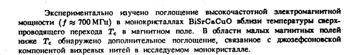 Экспериментально изучено поглощение высокочастотной электромагнитной мощности (/ кз 700 МГц) в монокристаллах BiSrCaCuO вблизи температуры сверхпроводящего перехода Гс в магнитном поле. В области малых магнитных полей ниже Тс обнаружено дополнительное поглощение, связанное с джозефсоновской компонентой вихревых нитей в исследуемом монокристалле.