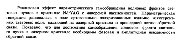 Реализован эффект параметрического самообращения волновых фронтов световых пучков в кристалле Nd:YAG с инверсией населенностей. Параметрическая генерация развивалась в поле ортогонально поляризованных взаимно некогерентных световых волн: падающей на лазерный кристалл и прошедшей петлю обратной связи. Показано, что для достижения самообращения волнового фронта светового пучка в лазерном кристалле необходимы фазовая и амплитудная невзаимности обратной связи.