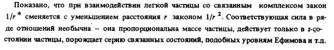 Показано, что при взаимодействии легкой частицы со связанным комплексом закон 1/г4 сменяется с уменьшением расстояния г законом 1/г 2. Соответствующая сила в ряде отношений необычна она пропорциональна массе частицы, действует только в достоянии частицы, порождает серию связанных состояний, подобных уровням Ефимова и т.д.