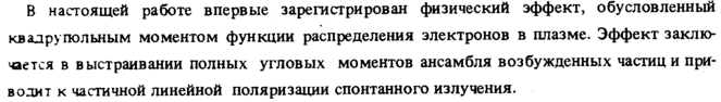 В настоящей работе впервые зарегистрирован физический эффект, обусловленный квадрупольным моментом функции распределения электронов в плазме. Эффект заключается в выстраивании полных угловых моментов ансамбля возбужденных частиц и приводит к частичной линейной поляризации спонтанного излучения.