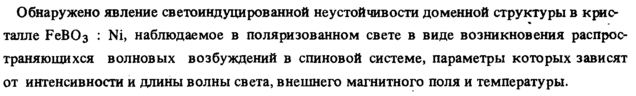 Обнаружено явление светоиндуцированной неустойчивости доменной структуры в кристалле FeBC>3 : Ni, наблюдаемое в поляризованном свете в виде возникновения распространяющихся волновых возбуждений в спиновой системе, параметры которых зависят от интенсивности и длины волны света, внешнего магнитного поля и температуры.