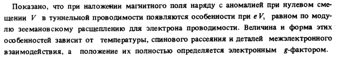 Показано, что при наложении магнитного поля наряду с аномалией при нулевом смещении V в туннельной проводимости появляются особенности при е Vy равном по модулю зеемановскому расщеплению для электрона проводимости. Величина и форма этих особенностей зависит от температуры, спинового рассеяния и деталей межэлектронного взаимодействия, а положение их полностью определяется электронным ^-фактором.