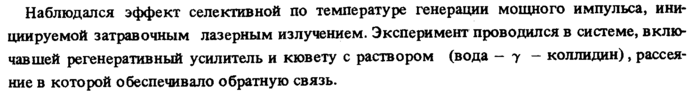 Наблюдался эффект селективной по температуре генерации мощного импульса, инициируемой затравочным лазерным излучением. Эксперимент проводился в системе, включавшей регенеративный усилитель и кювету с раствором (вода у колли дин), рассеяние в которой обеспечивало обратную связь.