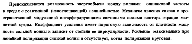 Предсказывается возможность энергообмена между волнами одинаковой частоты в средах с реактивной (непоглощающей) нелинейностью. Механизм явления связан с пространственной модуляцией интерферирующими световыми полями вектора гирации магнитной среды. Коэффициент усиления имеет пороговую зависимость от плотности мощности сильной волны и зависит от степени ее циркулярное™. Усиление максимально при линейной поляризации сильной волны и отсутствует, когда поляризация круговая.
