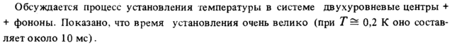 Обсуждается процесс установления температуры в системе двухуровневые центры + + фононы. Показано, что время установления очень велико (при Г= 0,2 К оно составляет около 10 мс).