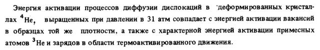 Энергия активации процессов диффузии дислокаций в деформированных кристаллах 4Не? выращенных при давлении в 31 атм совпадает с энергией активации вакансий в образцах той же плотности, а также с характерной энергией активации примесных атомов 3Не и зарядов в области термоактивированного движения.