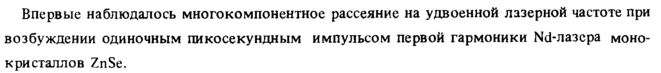 Впервые наблюдалось многокомпонентное рассеяние на удвоенной лазерной частоте при возбуждении одиночным пикосекундным импульсом первой гармоники Nd-лазера монокристаллов ZnSe.