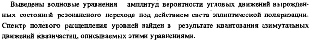 Выведены волновые уравнения амплитуд вероятности угловых движений вырожденных состояний резонансного перехода под действием света эллиптической поляризации. Спектр полевого расщепления уровней найден в результате квантования азимутальных движений квазичастиц, описываемых этими уравнениями.
