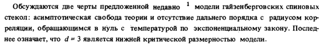 Обсуждаются две черты предложенной недавно модели гайзенберговских спиновых стекол: асимптотическая свобода теории и отсутствие дальнего порядка с радиусом корреляции, обращающимся в нуль с температурой по экспоненциальному закону. Последнее означает, что d ~ 3 является нижней критической размерностью модели.