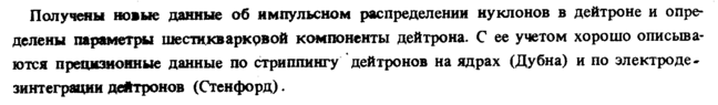 Получены новые данные об импульсном распределении нуклонов в дейтроне и определены параметры шести кваркрвой компоненты дейтрона. С ее учетом хорошо описываются прецизионные данные по стриппингу дейтронов на ядрах (Дубна) и по электроде-зинтеграции дейтронов (Стенфорд).