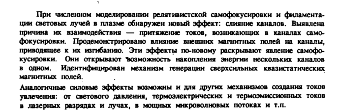 При численном моделировании релятивистской самофокусировки и филамента-ции световых лучей в плазме обнаружен новый эффект: слияние каналов. Выявлена причина их взаимодействия — притяжение токов, возникающих в каналах самофокусировки. Продемонстрировано влияние внешних магнитных полей на каналы, приводящее к их изгибанию. Эти эффекты по-новому раскрывают явление самофокусировки. Они открывают возможность накопления энергии нескольких каналов в одном. Идентифицирован механизм генерации сверхсильных квазистатических магнитных полей. Аналогичные силовые эффекты возможны и для других механизмов создания токов увлечения: от светового давления, термоэлектрических и термоэмиссионных токов в лазерных разрядах и лучах, в мощных микроволновых потоках и т.п.