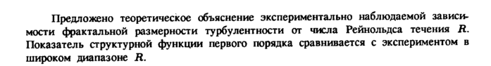 Предложено теоретическое объяснение экспериментально наблюдаемой зависимости фрактальной размерности турбулентности от числа Рейнольдса течения Я. Показатель структурной функции первого порядка сравнивается с экспериментом в широком диапазоне Я.