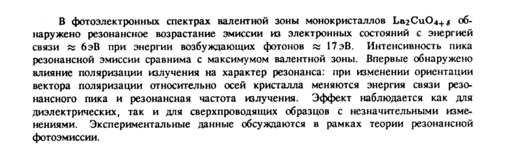 В фотоэлектронных спектрах валентной зоны монокристаллов ЬагСиС>4+» обнаружено резонансное возрастание эмиссии из электронных состояний с энергией связи и 6эВ при энергии возбуждающих фотонов « 17эВ. Интенсивность пика резонансной эмиссии сравнима с максимумом валентной зоны. Впервые обнаружено влияние поляризации излучения на характер резонанса: при изменении ориентации вектора поляризации относительно осей кристалла меняются энергия связи резонансного пика и резонансная частота излучения. Эффект наблюдается как для диэлектрических, так и для сверхпроводящих образцов с незначительными изменениями. Экспериментальные данные обсуждаются в рамках теории резонансной фотоэмиссии.