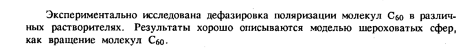 Экспериментально исследована дефазировка поляризации молекул Сбо в различных растворителях. Результаты хорошо описываются моделью шероховатых сфер, как вращение молекул Сбо
