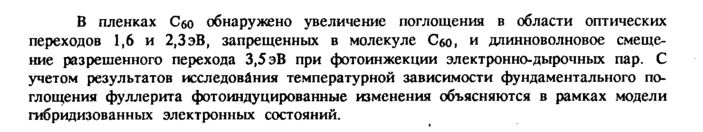 В пленках Сбо обнаружено увеличение поглощения в области оптических переходов 1,6 и 2,ЗэВ, запрещенных в молекуле Сбо, и длинноволновое смещение разрешенного перехода 3,5эВ при фотоинжекции электронно-дырочных пар. С учетом результатов исследования температурной зависимости фундаментального поглощения фуллерита фотоиндуцированные изменения объясняются в рамках модели гибридизованных электронных состояний.