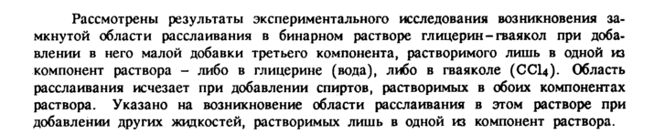 Рассмотрены результаты экспериментального исследования возникновения замкнутой области расслаивания в бинарном растворе глицерин-гваякол при добавлении в него малой добавки третьего компонента, растворимого лишь в одной из компонент раствора либо в глицерине (вода), либо в гваяколе (ССЦ). Область расслаивания исчезает при добавлении спиртов, растворимых в обоих компонентах раствора. Указано на возникновение области расслаивания в этом растворе при добавлении других жидкостей, растворимых лишь в одной из компонент раствора.