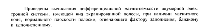 Приведены вычисления дифференциальной магнитоемкости двумерной электронной системы, имеющей вид экранированной полосы, при наличии магнитного поля, нормального плоскости полоски, отвечающего фактору заполнения, близкому к целочисленному.