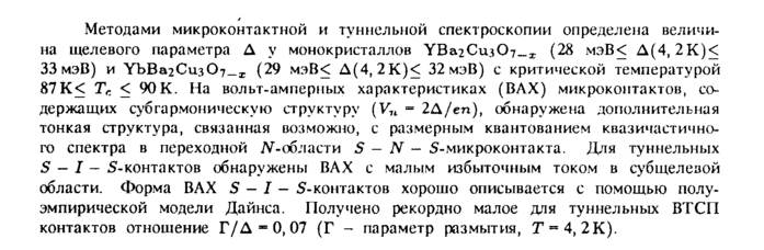 Методами микроконтактной и туннельной спектроскопии определена величина щелевого параметра Δ у монокристаллов УВа2Сиз07_х (28 мэВ< Δ(4, 2К)< 33 мэВ) и УЬВа2Сиз07_х (29 мэВ< Δ(4, 2К)< 32мэВ) с критической температурой 87 К< Тг. < 90К. На вольт-амперных характеристиках (ΒΑΧ) микроконтактов, содержащих субгармоническую структуру (V„ 2Δ/εη), обнаружена дополнительная тонкая структура, связанная возможно, с размерным квантованием квазичастичного спектра в переходной N-области S N — S-микроконтакта. Для туннельных S — I — 5-контактов обнаружены ΒΑΧ с малым избыточным током в субщелезой области. Форма ΒΑΧ S — I — Sконтактов хорошо описывается с помощью полуэмпирической модели Дайнса. Получено рекордно малое для туннельных ВТСП контактов отношение Γ/Δ=0,07 (Г параметр размытия, Τ = 4, 2К).