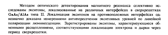 Методом оптического детектирования магнитного резонанса селективно исследованы экситоны, локализованные на различных интерфейсах в сверхрешетках GaAs/AlAs типа П. Локализация экситонов на противоположных интерфейсах однозначно доказана измерениями антипересечения экситонных уровней по линейной поляризации люминесценции. Зарегистрированы экситоны, характеризующиеся обменными расщеплениями, соответствующими локализации электрона и дырки через период сверхрешетки.